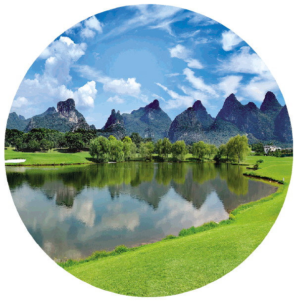 ↓桂海晴岚的草坪、湖泊和远处的群山、蓝天白云组成一幅山水美景图,随手一拍都是大片。 记者邢刚 摄