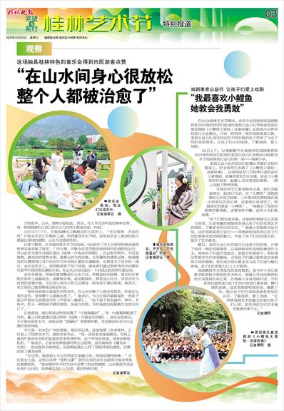 “在这里,我感到人与大自然是完美融合的,现场氛围特别棒。”市民张女士说,这些以各种“桂林元素”创作出来的音乐也是吸引她来现场的重要原因,“我很想听听平时生活中见惯了的这些植物、山水被创作成音乐是什么样的,结果确实没让人失望,真的特别疗愈。”