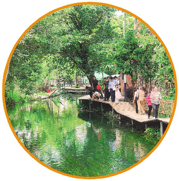 走在村中的步道上,不时能看到一群群鱼儿在水中畅游,而在另一头的溪流中,密密麻麻的水草遍布河底,每一片叶子都清晰可见。村民们散养的麻鸭在河面游着,不时下潜在水草间觅食。