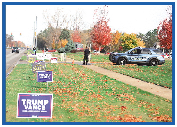 10月29日,共和党副总统候选人万斯在美国密歇根州萨吉诺镇举行竞选集会,集会地点附近插了许多支持特朗普和万斯的标牌。 新华社记者徐剑梅 摄