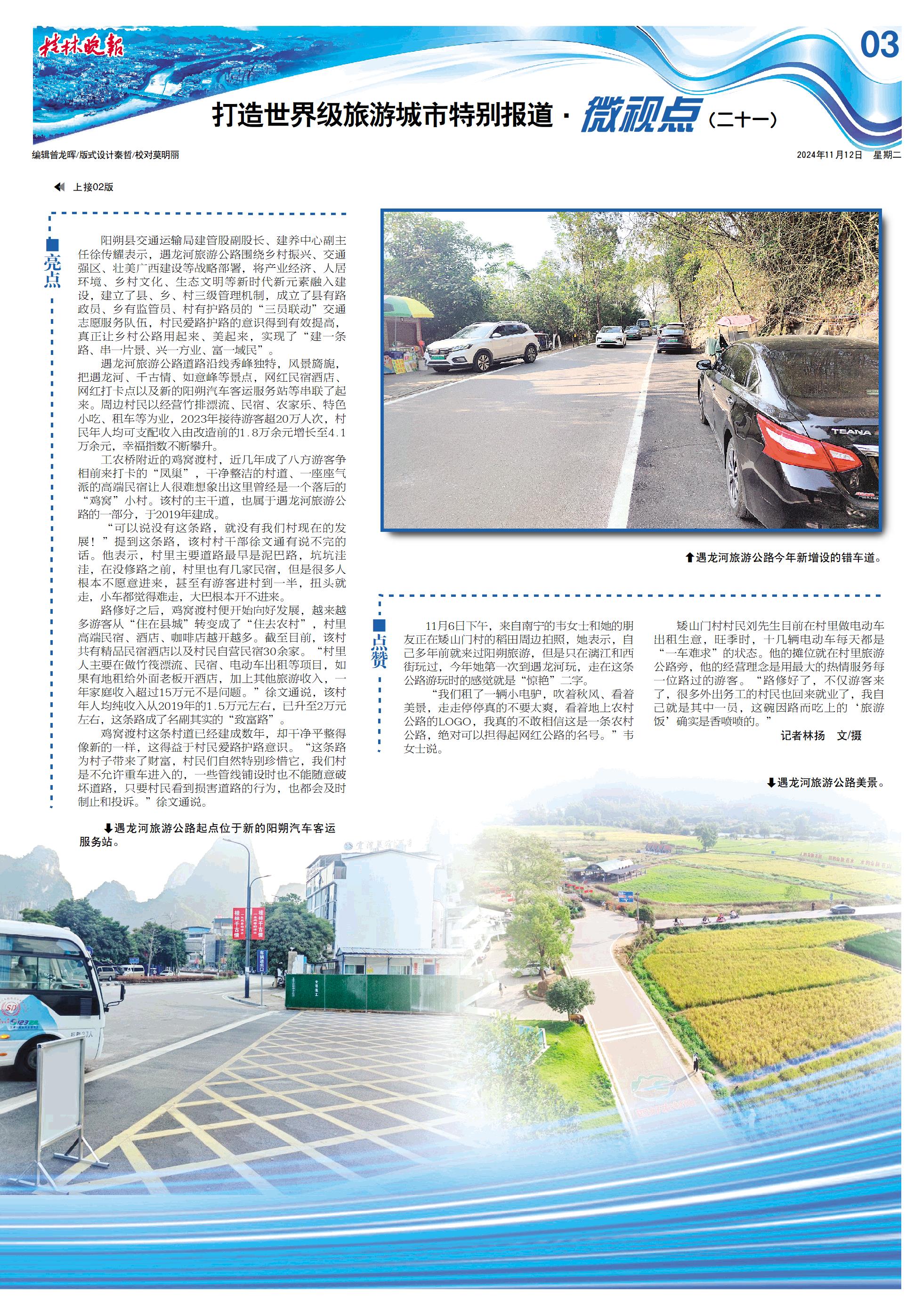 阳朔县交通运输局建管股副股长、建养中心副主任徐传耀表示,遇龙河旅游公路围绕乡村振兴、交通强区、壮美广西建设等战略部署,将产业经济、人居环境、乡村文化、生态文明等新时代新元素融入建设,建立了县、乡、村三级管理机制,成立了县有路政员、乡有监管员、村有护路员的“三员联动”交通志愿服务队伍,村民爱路护路的意识得到有效提高,真正让乡村公路用起来、美起来,实现了“建一条路、串一片景、兴一方业、富一域民”。