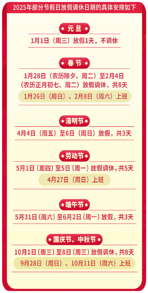 经党中央、国务院批准,根据2024年11月修订的《全国年节及纪念日放假办法》,自2025年1月1日起,全体公民放假的假日增加2天,其中春节、劳动节各增加1天。据此对放假调休原则作进一步优化完善,除个别特殊情形外,春节自农历除夕起放假调休8天,国庆节自10月1日起放假调休7天,劳动节放假调休5天,元旦、清明节、端午节、中秋节分别放假调休或连休3天(如逢周三则只在当日放假),国庆节放假如逢中秋节则合并放假8天。