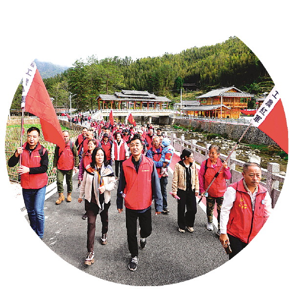 本报讯(记者刘健)11月18日,由桂林市融媒体中心、桂林湘江战役文传中心主办的“纪念红军长征出发九十周年·重走长征路”资源段第三日活动顺利开展,百余名队员身穿红色马甲,走进了两水苗族乡。此次重走长征路从塘洞村西寨出发,经赵氏宗祠、大朝门、源头、大竹坪到达雷公田寺,最后队伍在李洞寨结束行程,全程12.5公里。