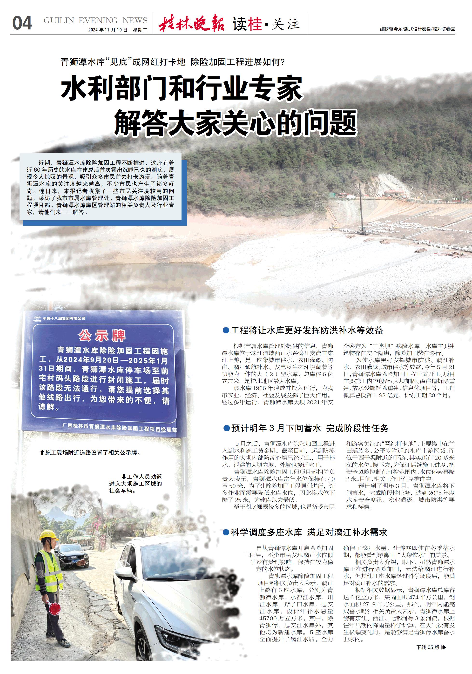 为使水库更好发挥城市防洪、漓江补水、农田灌溉、城市供水等效益,今年5月21日,青狮潭水库除险加固工程正式开工。项目主要施工内容包含:大坝加固、溢洪道拆除重建、放水设施拆除重建、信息化项目等,工程概算总投资1.93亿元,计划工期30个月。
