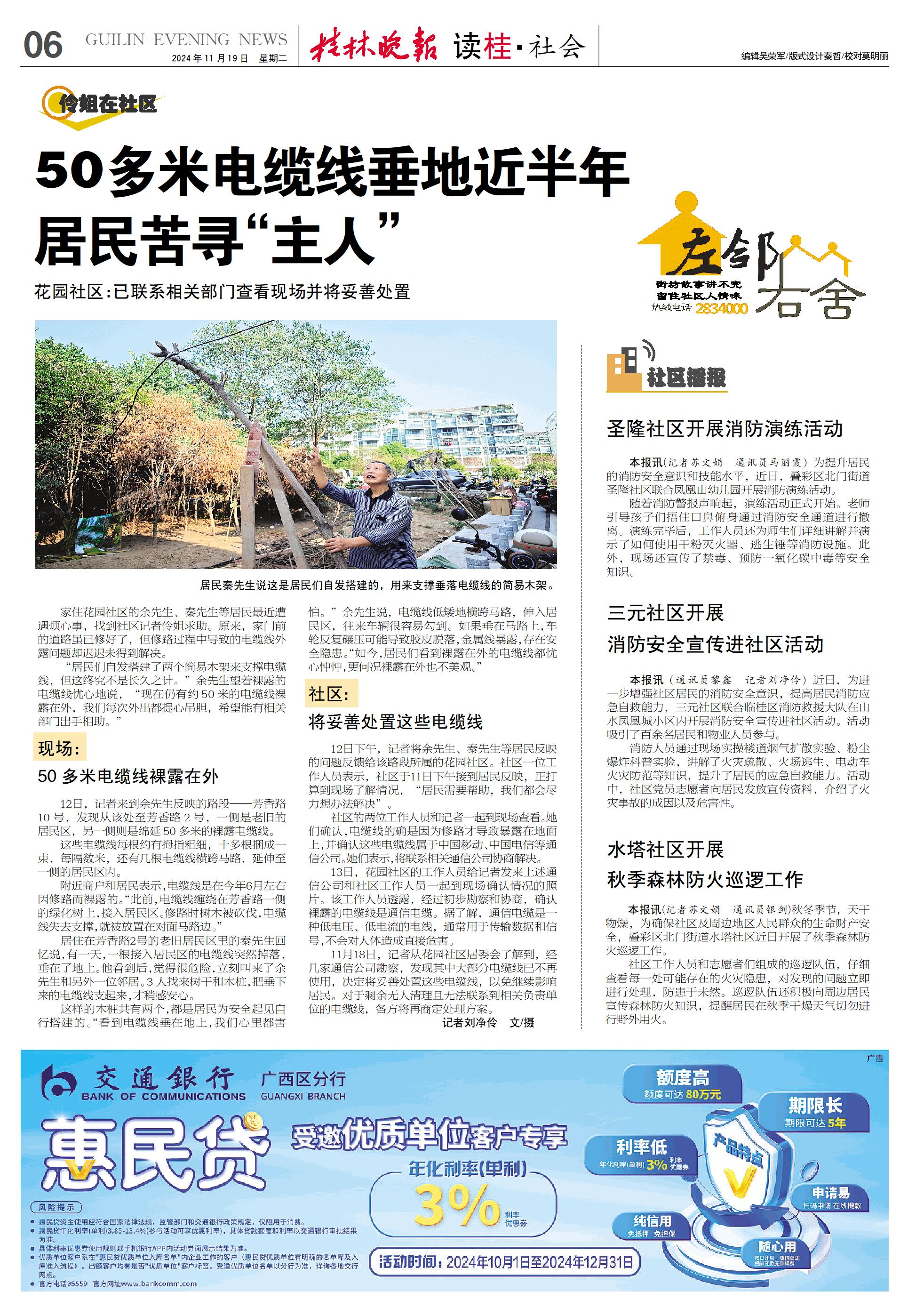 “居民们自发搭建了两个简易木架来支撑电缆线,但这终究不是长久之计。”余先生望着裸露的电缆线忧心地说,“现在仍有约50米的电缆线裸露在外,我们每次外出都提心吊胆,希望能有相关部门出手相助。”