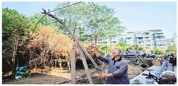 居住在芳香路2号的老旧居民区里的秦先生回忆说,有一天,一根接入居民区的电缆线突然掉落,垂在了地上。他看到后,觉得很危险,立刻叫来了余先生和另外一位邻居。3人找来树干和木桩,把垂下来的电缆线支起来,才稍感安心。