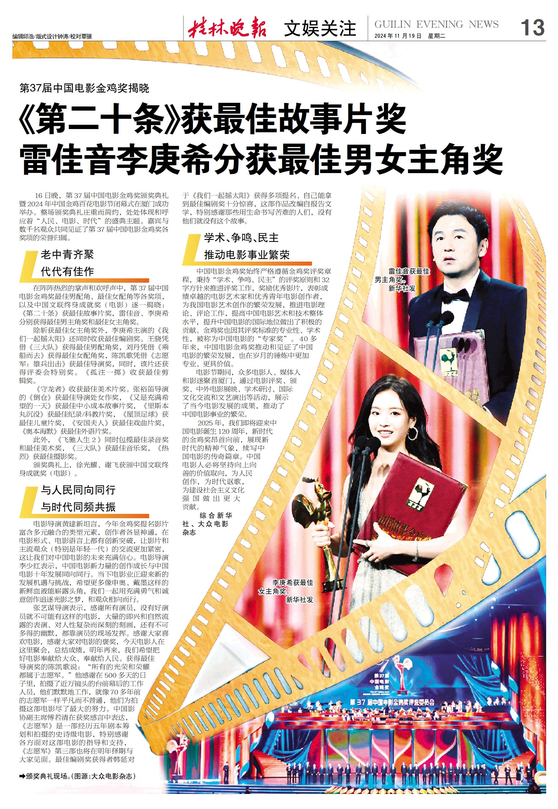 在阵阵热烈的掌声和欢呼声中,第37届中国电影金鸡奖最佳男配角、最佳女配角等各奖项,以及中国文联终身成就奖(电影)逐一揭晓:《第二十条》获最佳故事片奖,雷佳音、李庚希分别获得最佳男主角奖和最佳女主角奖。