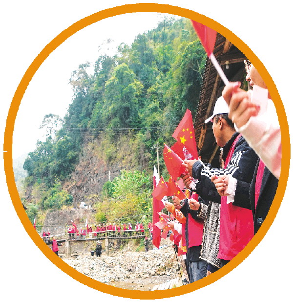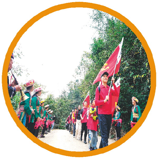 ↓队伍来到东源村红色瑶寨新寨村时,受到瑶族同胞的热烈欢迎。
