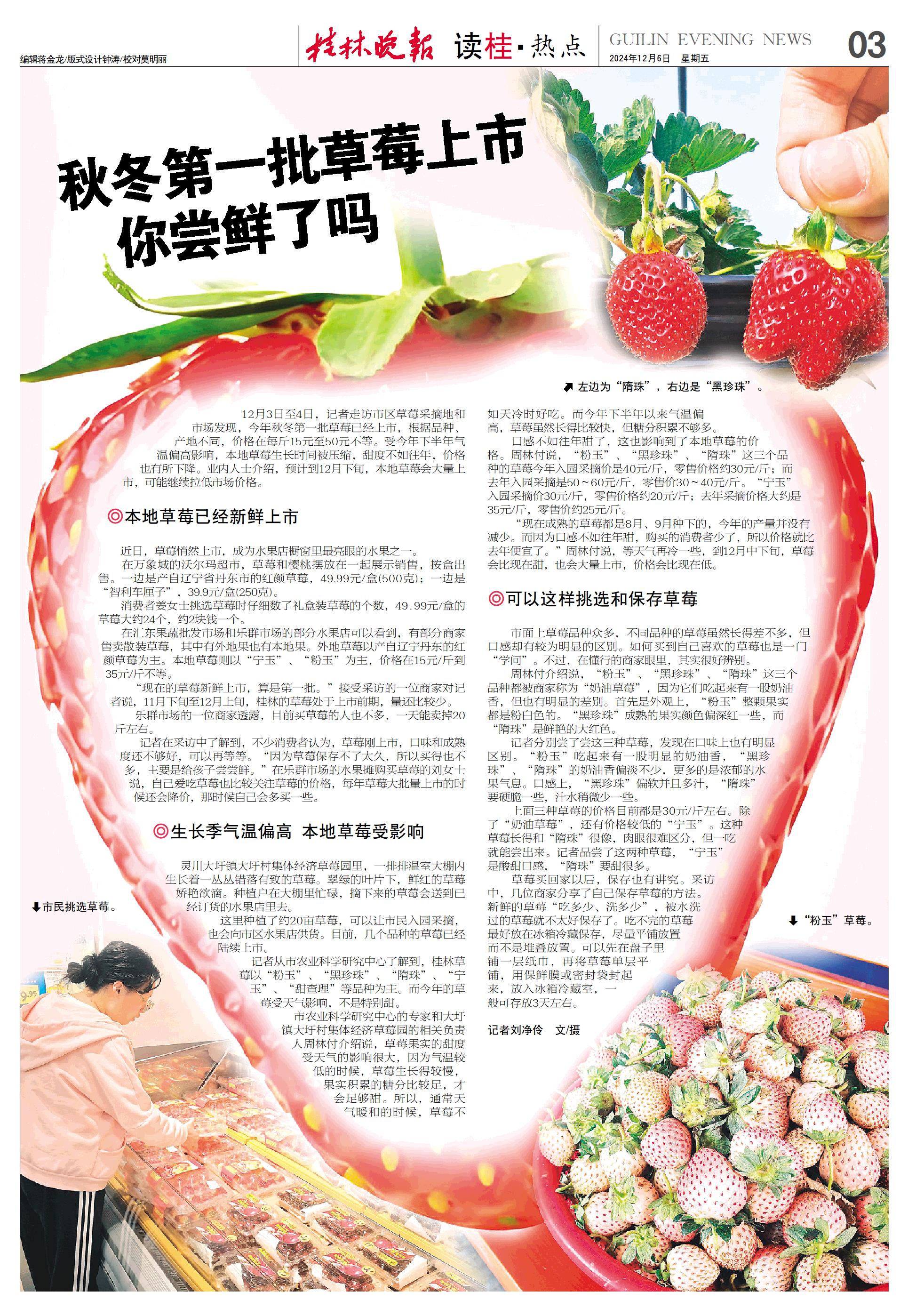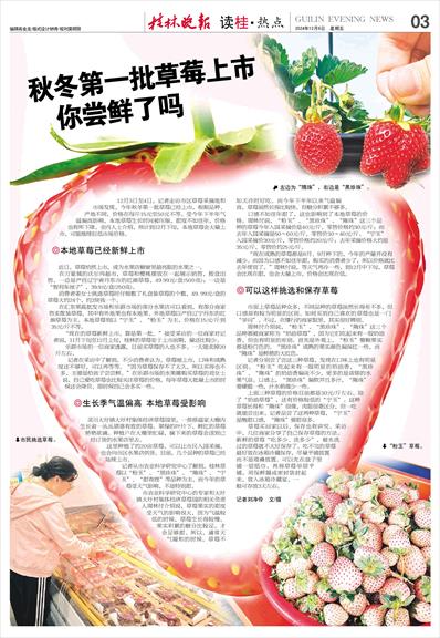 “现在的草莓新鲜上市,算是第一批。”接受采访的一位商家对记者说,11月下旬至12月上旬,桂林的草莓处于上市前期,量还比较少。