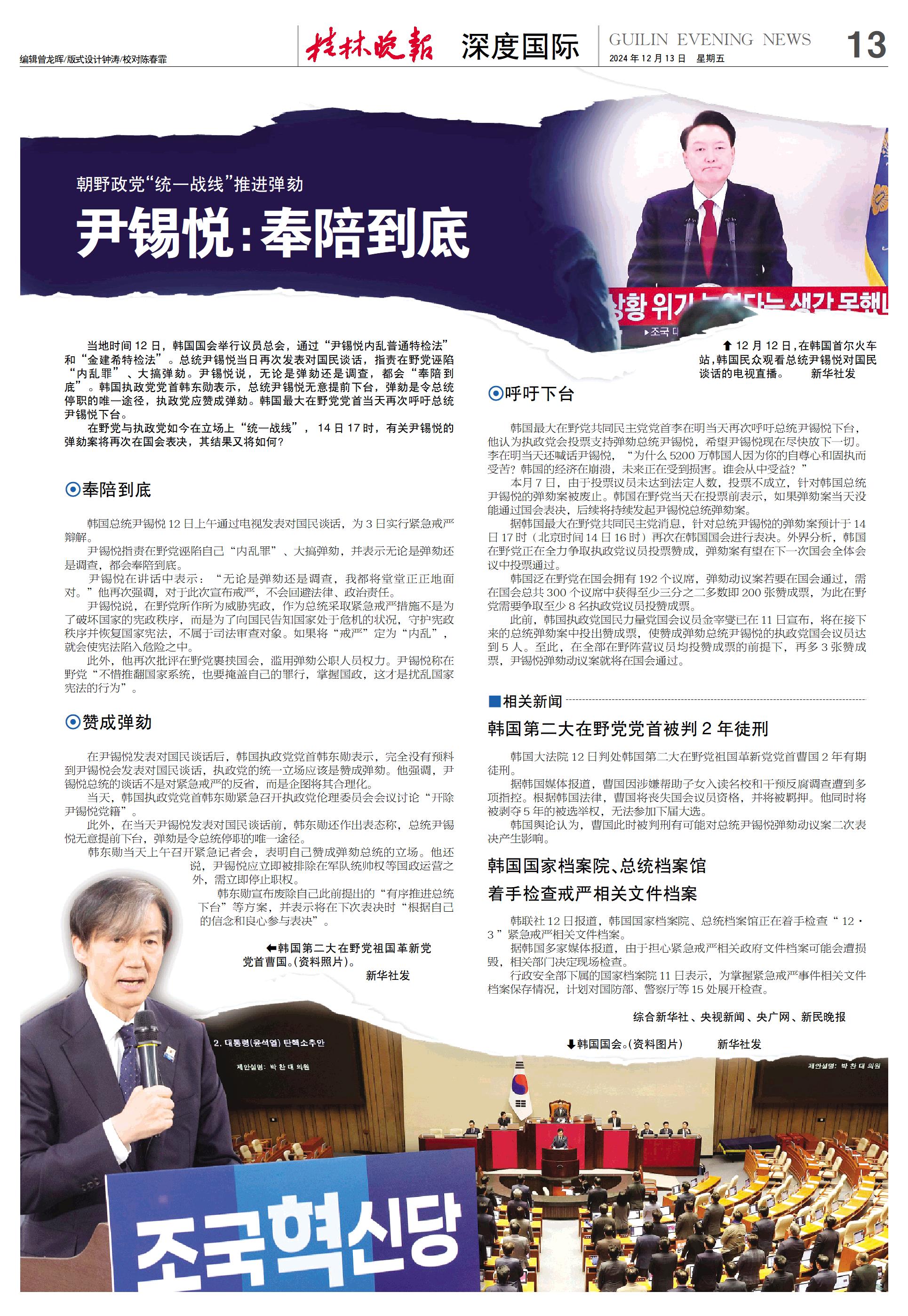 当地时间12日,韩国国会举行议员总会,通过“尹锡悦内乱普通特检法”和“金建希特检法”。总统尹锡悦当日再次发表对国民谈话,指责在野党诬陷“内乱罪”、大搞弹劾。尹锡悦说,无论是弹劾还是调查,都会“奉陪到底”。韩国执政党党首韩东勋表示,总统尹锡悦无意提前下台,弹劾是令总统停职的唯一途径,执政党应赞成弹劾。韩国最大在野党党首当天再次呼吁总统尹锡悦下台。