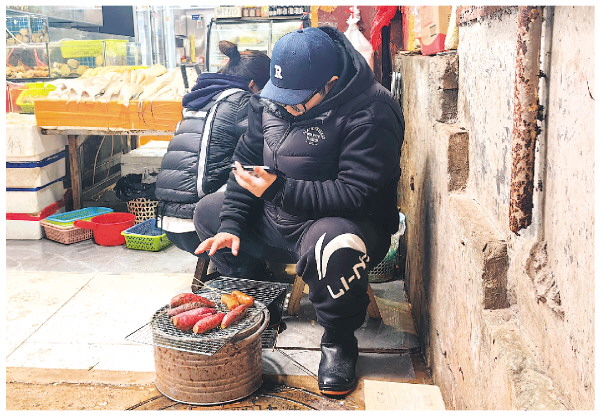12月11日中午,市区温度降至大约7℃,伴随着阵阵北风,寒意倍增。在乐群市场的一角,一位售卖水产品的摊主坐在火炉旁取暖,火炉上正烤着红薯与肉肠,既温暖人心又香气四溢。 记者邢刚 摄
