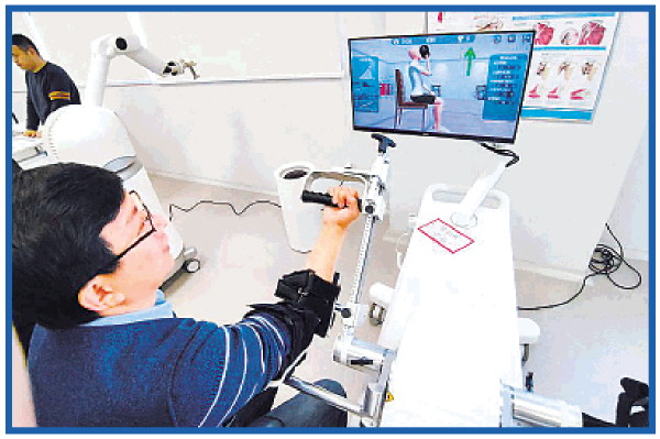 这不是一台游戏机,而是北京埃斯顿医疗科技有限公司的上肢康复训练系统。与传统齿轮驱动康复设备不同,这个上肢康复训练系统,采用绳传动技术。“绳传动是柔顺且逆向可驱,不存在‘死锁’问题,无需外部力传感器也可以实现精确力反馈,且力反馈效果良好。”产品经理孙士安请记者亲身体验。确如他所言,记者感到机械臂带动着人的手臂,自如运动。人体隐隐约约好像受到了某种助力,但非常柔顺、丝滑。