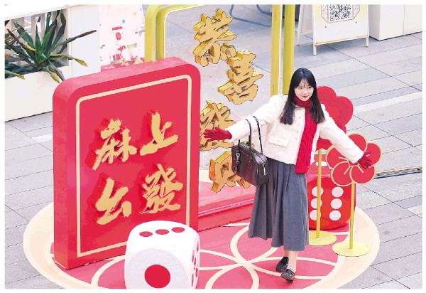 随着春节临近,市区一些商场都布置了别具一格的摆件,烘托节日气氛。图为1月16日中午,一位市民在摆件旁拍照。记者邢刚 摄