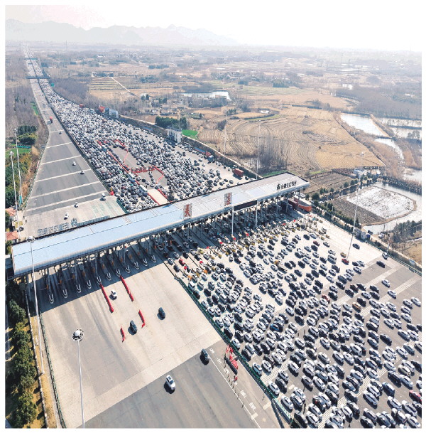2月4日,节后返程车辆通过合宁高速公路吴庄收费站(无人机照片)。