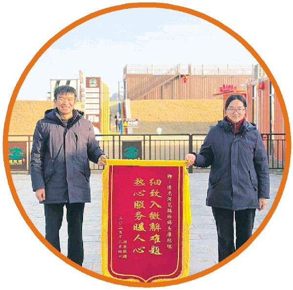 在这85份表扬工单中,令阳朔县遇龙河景区旅游发展有限公司党委委员李长益印象深刻的是,2月9日,阳朔遇龙河景区览胜桥码头办公室收到一面外地游客寄来的锦旗。上面写着“细致入微解难题 热心服务暖人心”的字样,是游客敬赠给码头工作人员的。