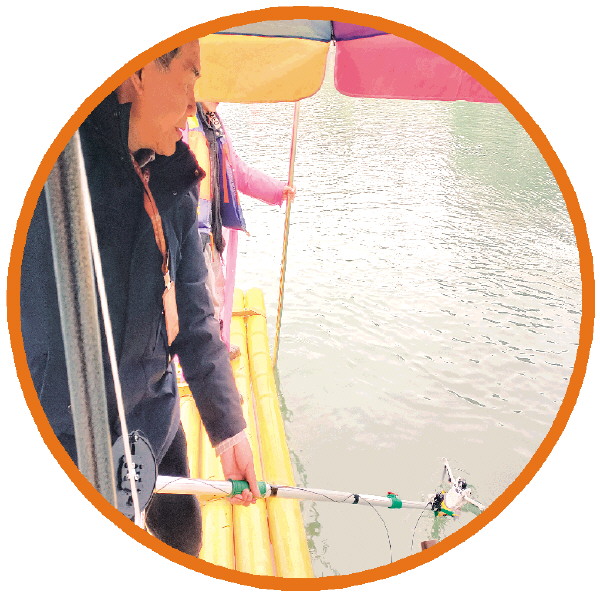 遇龙河景区工作人员帮助游客打捞掉落水里的无人机。(受访者供图)