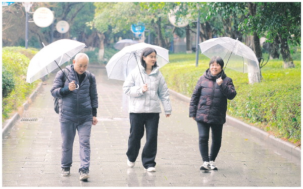 2月12日,来自天津的游客董女士带着父母在榕湖附近漫步,欣赏雨中的湖光山色。董女士说,他们特意避开春节假期的旅游高峰来到桂林,这几天的游玩体验很不错。 记者邢刚 摄