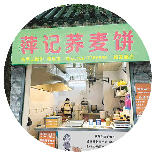 在美食众多的施家园路上,萍记荞麦饼的绿色招牌或许并不十分显眼,但用餐时段顾客在店门前排队购买的场景,却足以吸引过往行人的目光。