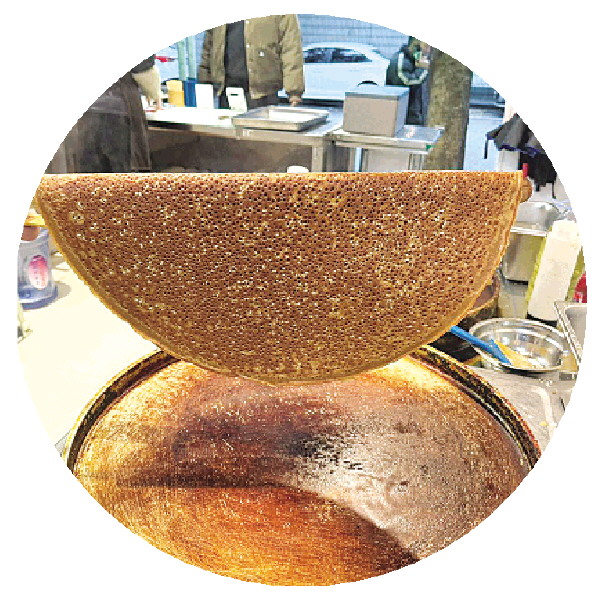 说话间,老板开始制作荞麦饼。他熟练地将面糊倒在煎饼铛内均匀抹开,待一面煎至金黄诱人时,再撒上白芝麻。随后,轻巧地用工具将面皮翻转,细心地煎烤另一面,直至饼身呈现出诱人的焦糖色,一个香气扑鼻的芝麻荞麦饼便新鲜出炉了,整个过程耗时约8分钟。