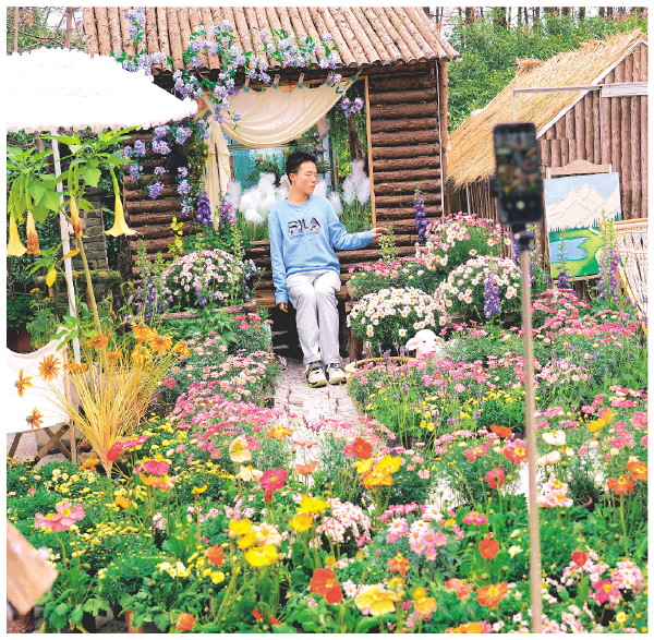 2月18日,在桂湖边一个开满鲜花的小院,一位市民坐在花丛中自拍。