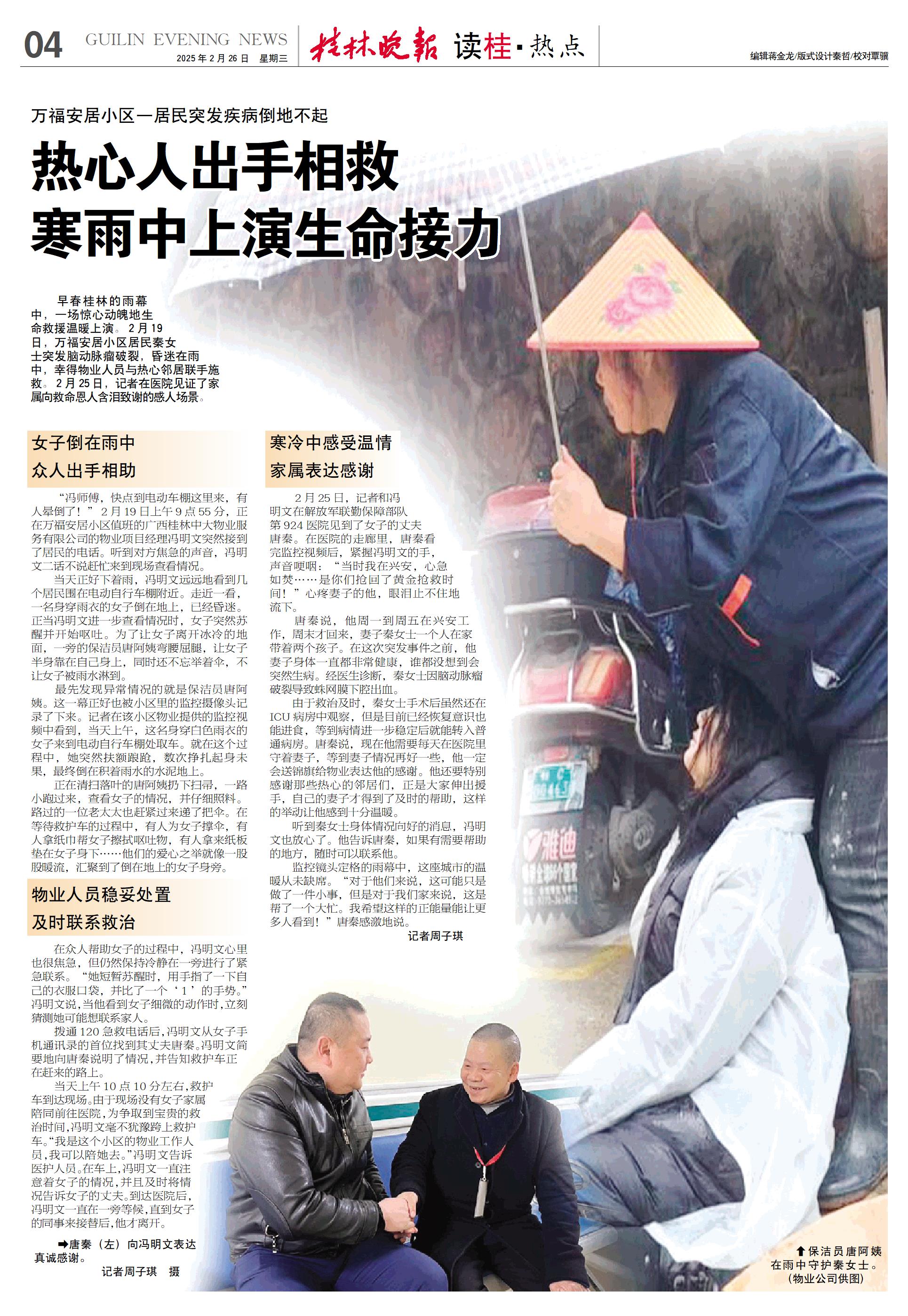 早春桂林的雨幕中,一场惊心动魄地生命救援温暖上演。2月19日,万福安居小区居民秦女士突发脑动脉瘤破裂,昏迷在雨中,幸得物业人员与热心邻居联手施救。2月25日,记者在医院见证了家属向救命恩人含泪致谢的感人场景。