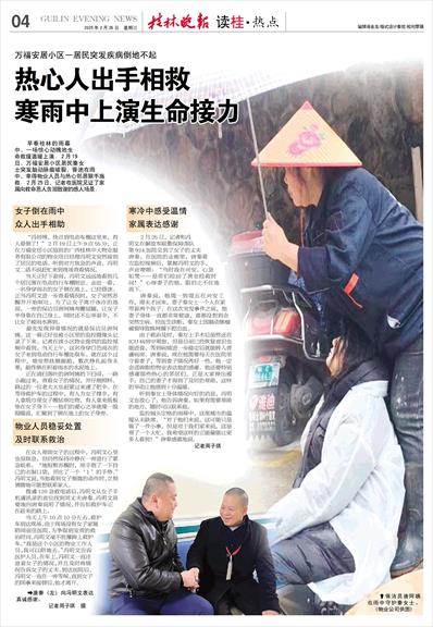 “冯师傅,快点到电动车棚这里来,有人晕倒了!”2月19日上午9点55分,正在万福安居小区值班的广西桂林中大物业服务有限公司的物业项目经理冯明文突然接到了居民的电话。听到对方焦急的声音,冯明文二话不说赶忙来到现场查看情况。