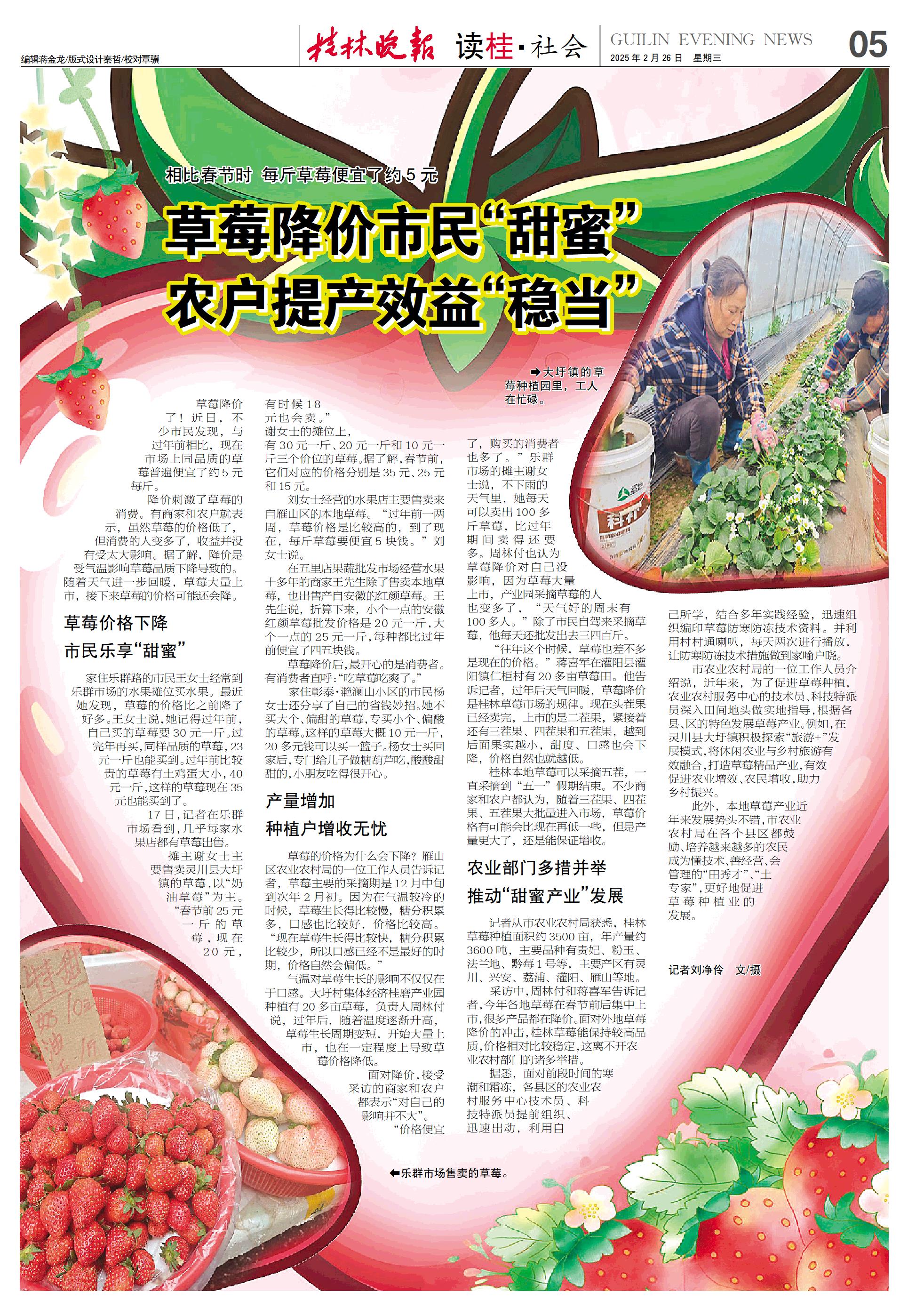 采访中,周林付和蒋喜军告诉记者,今年各地草莓在春节前后集中上市,很多产品都在降价。面对外地草莓降价的冲击,桂林草莓能保持较高品质,价格相对比较稳定,这离不开农业农村部门的诸多举措。