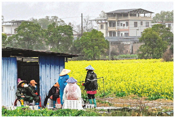 近日,在灵川县潭下镇一处农田里,忙完农活的村民们在休息。身后盛开的油菜花,为这段悠闲时光增添了几分情趣。 记者滕嘉 摄
