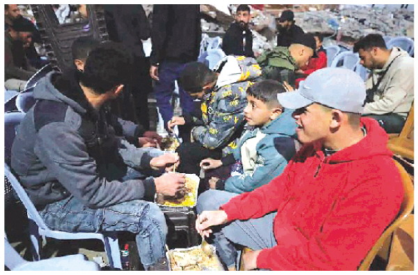 3月1日,在加沙地带北部杰巴利耶的废墟上,巴勒斯坦人在斋月的第一天共进开斋饭。 新华社发
