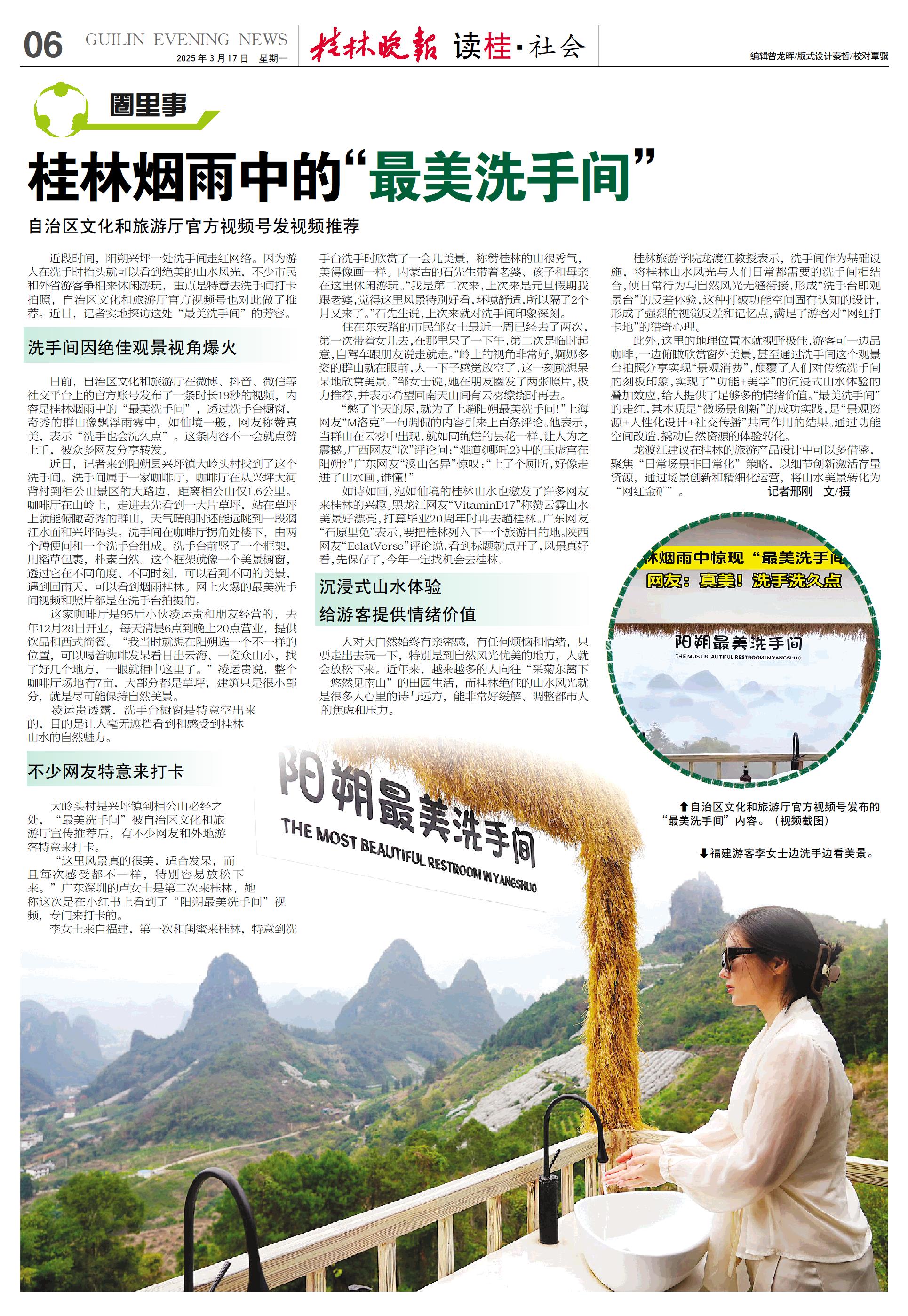 桂林旅游学院龙渡江教授表示,洗手间作为基础设施,将桂林山水风光与人们日常都需要的洗手间相结合,使日常行为与自然风光无缝衔接,形成“洗手台即观景台”的反差体验,这种打破功能空间固有认知的设计,形成了强烈的视觉反差和记忆点,满足了游客对“网红打卡地”的猎奇心理。