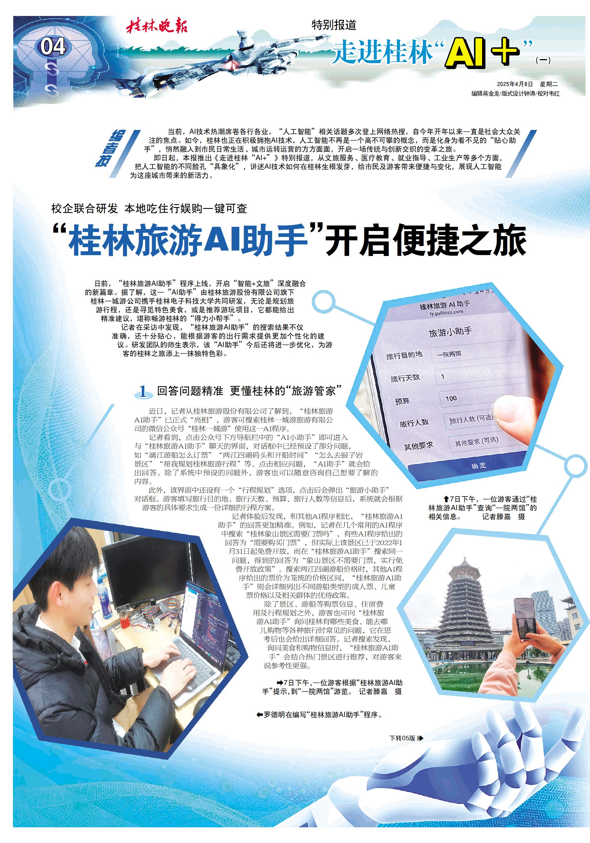 日前,“桂林旅游AI助手”程序上线,开启“智能+文旅”深度融合的新篇章。据了解,这一“AI助手”由桂林旅游股份有限公司旗下桂林一城游公司携手桂林电子科技大学共同研发,无论是规划旅游行程,还是寻觅特色美食,或是推荐游玩项目,它都能给出精准建议,堪称畅游桂林的“得力小帮手”。