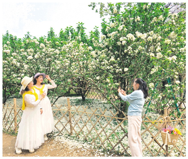 一场春雨过后,10日上午,南溪山公园樱花园里的中华木绣球落花遍地,白色的花瓣似雪般层层叠叠铺满地面,与枝头的花朵互相映衬。这番如梦似幻的美景,引得不少市民游客纷纷驻足观赏拍照。据了解,今年中华木绣球的花色更加艳丽,花期预计可持续至4月中下旬。