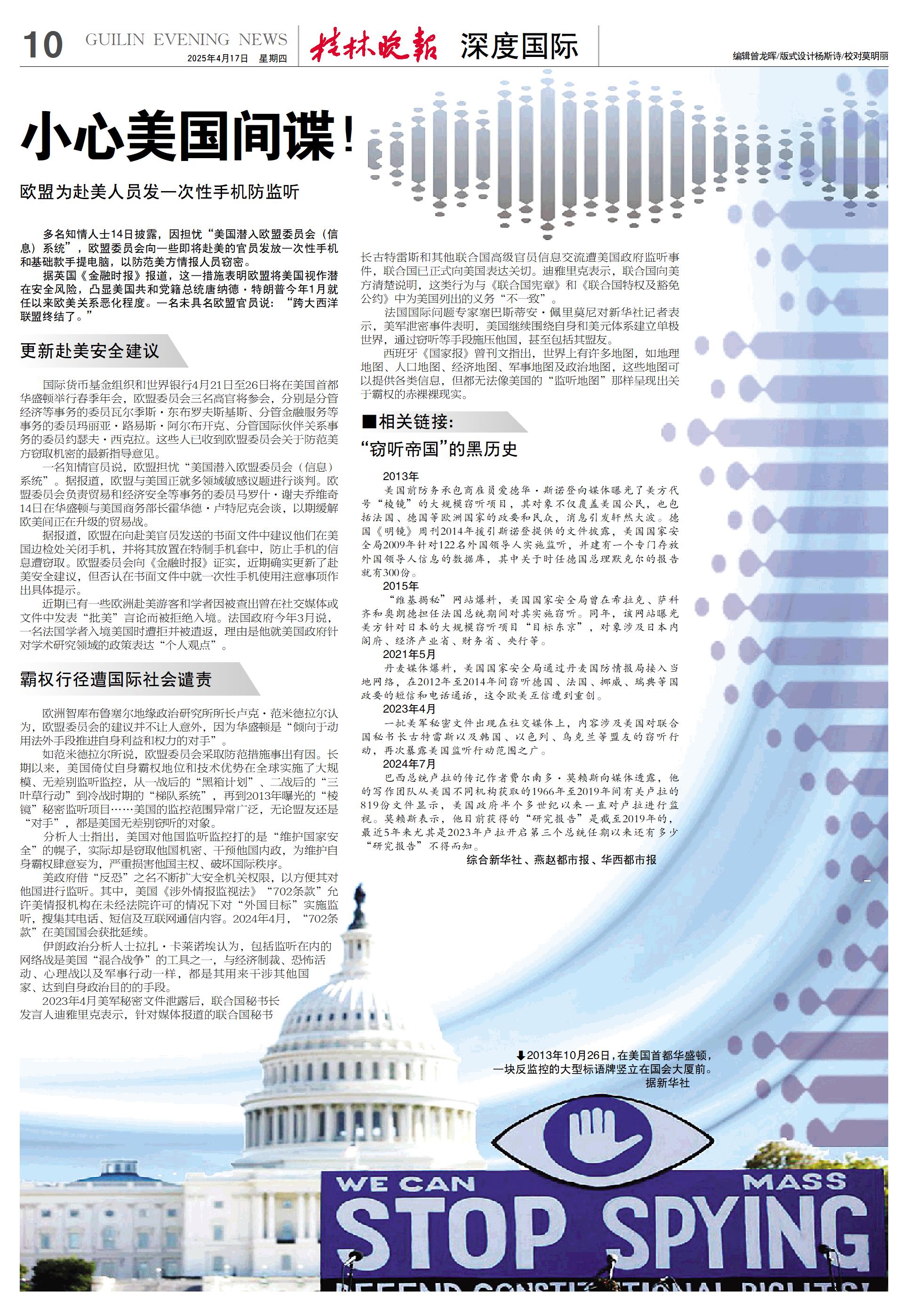 如范米德拉尔所说,欧盟委员会采取防范措施事出有因。长期以来,美国倚仗自身霸权地位和技术优势在全球实施了大规模、无差别监听监控,从一战后的“黑箱计划”、二战后的“三叶草行动”到冷战时期的“梯队系统”,再到2013年曝光的“棱镜”秘密监听项目……美国的监控范围异常广泛,无论盟友还是“对手”,都是美国无差别窃听的对象。