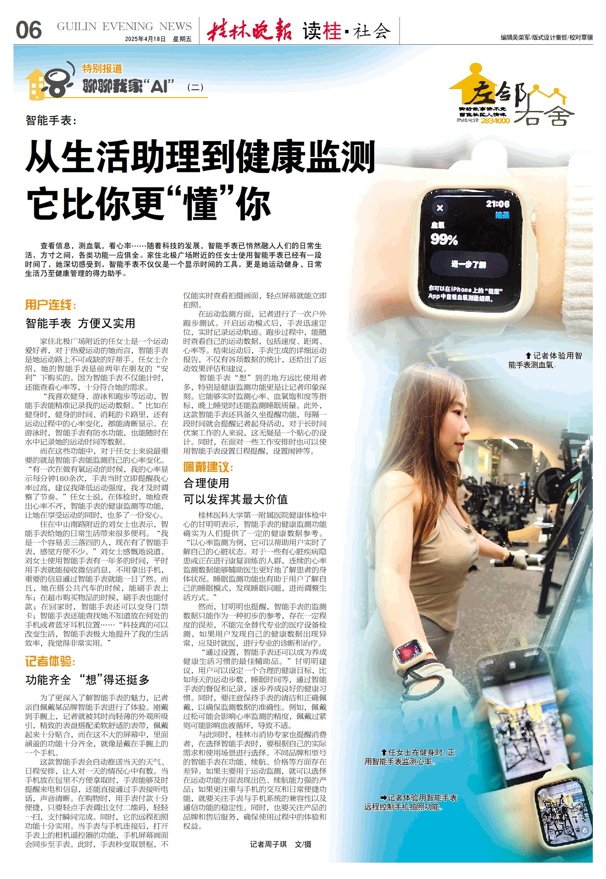 与此同时,桂林市消协专家也提醒消费者,在选择智能手表时,要根据自己的实际需求和使用场景进行选择。不同品牌和型号的智能手表在功能、续航、价格等方面存在差异。如果主要用于运动监测,就可以选择在运动功能方面表现出色、续航能力强的产品;如果更注重与手机的交互和日常便捷功能,就要关注手表与手机系统的兼容性以及通信功能的稳定性。同时,也要关注产品的品牌和售后服务,确保使用过程中的体验和权益。