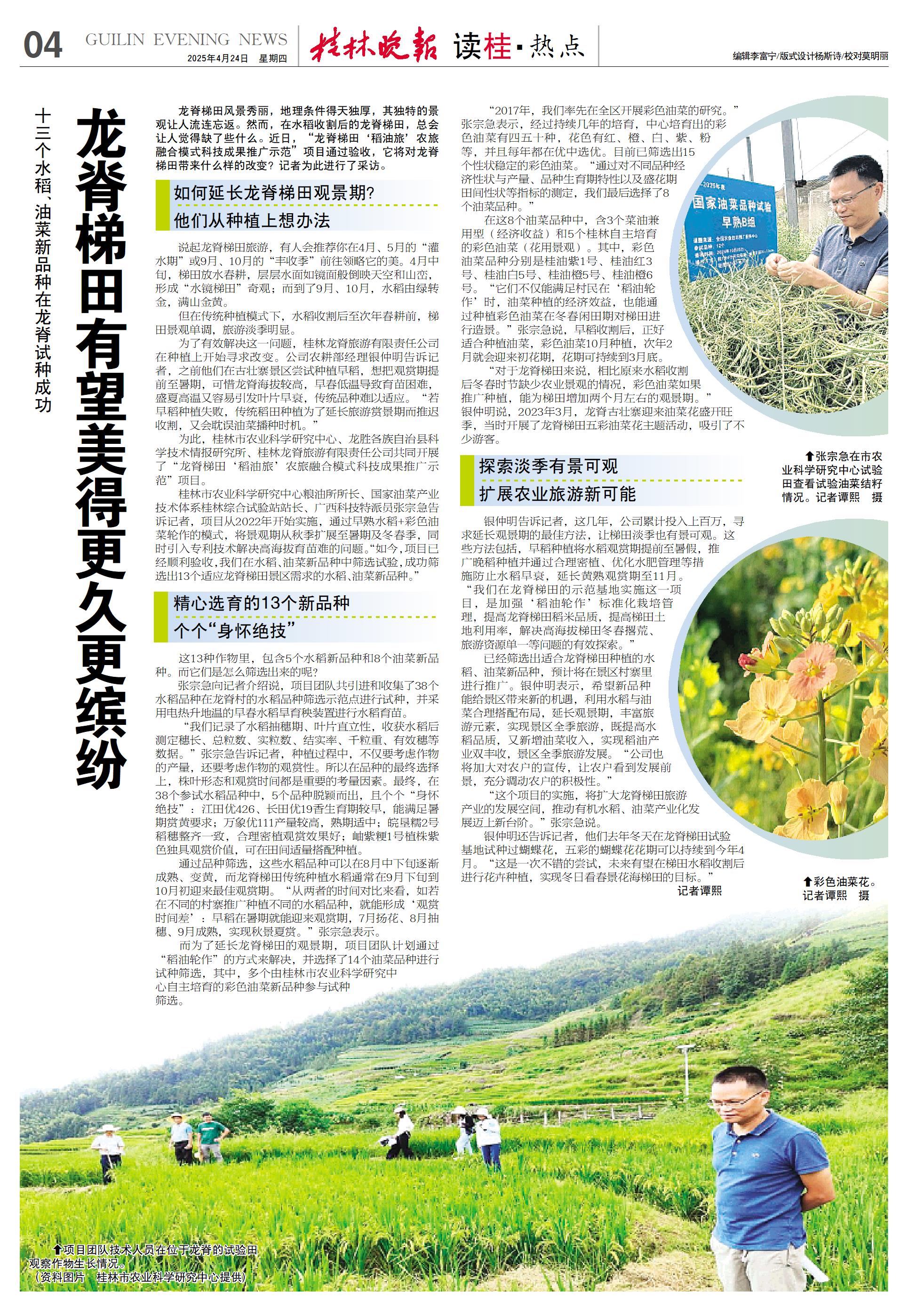 桂林市农业科学研究中心粮油所所长、国家油菜产业技术体系桂林综合试验站站长、广西科技特派员张宗急告诉记者,项目从2022年开始实施,通过早熟水稻+彩色油菜轮作的模式,将景观期从秋季扩展至暑期及冬春季,同时引入专利技术解决高海拔育苗难的问题。“如今,项目已经顺利验收,我们在水稻、油菜新品种中筛选试验,成功筛选出13个适应龙脊梯田景区需求的水稻、油菜新品种。”