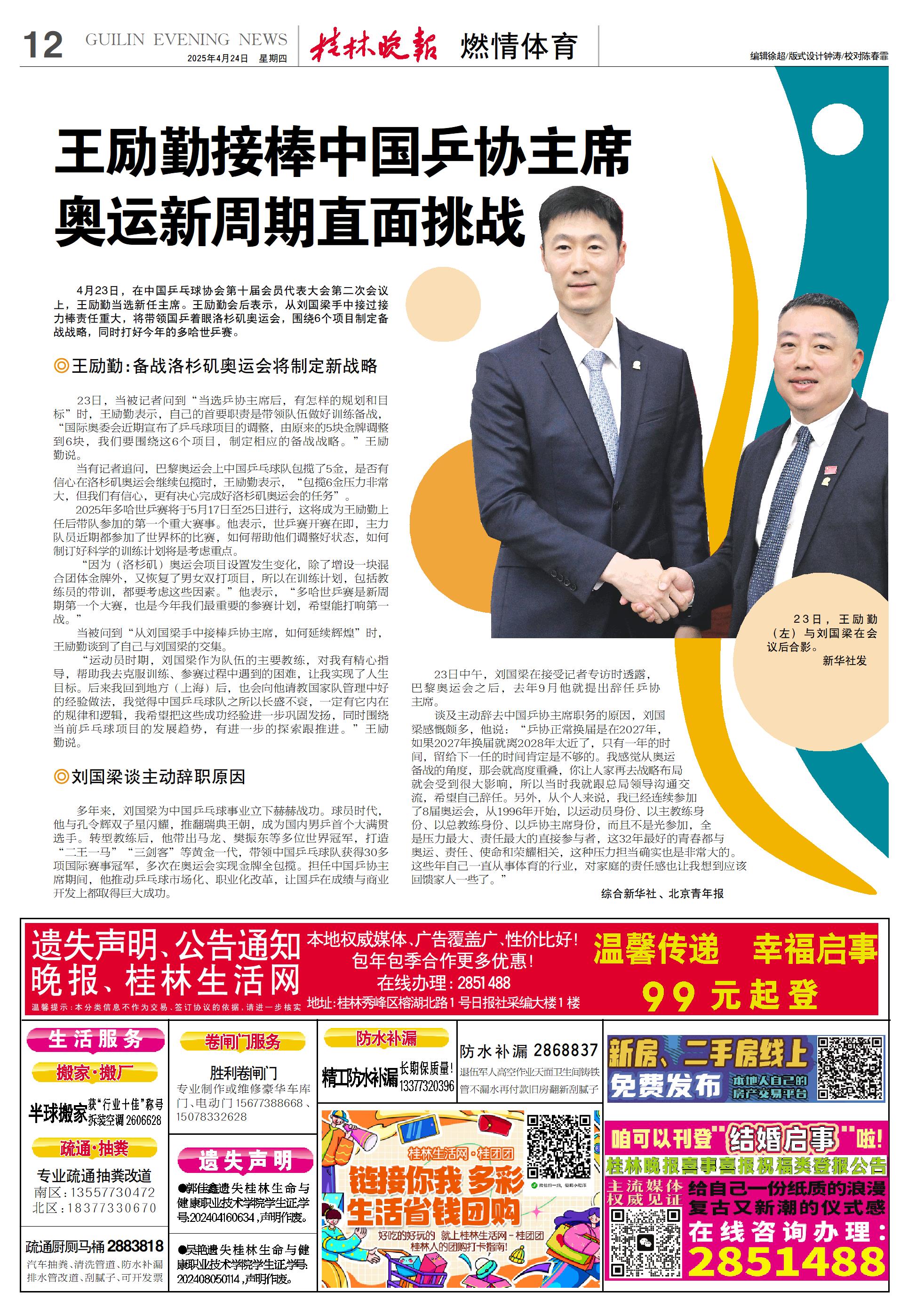 4月23日,在中国乒乓球协会第十届会员代表大会第二次会议上,王励勤当选新任主席。王励勤会后表示,从刘国梁手中接过接力棒责任重大,将带领国乒着眼洛杉矶奥运会,围绕6个项目制定备战战略,同时打好今年的多哈世乒赛。