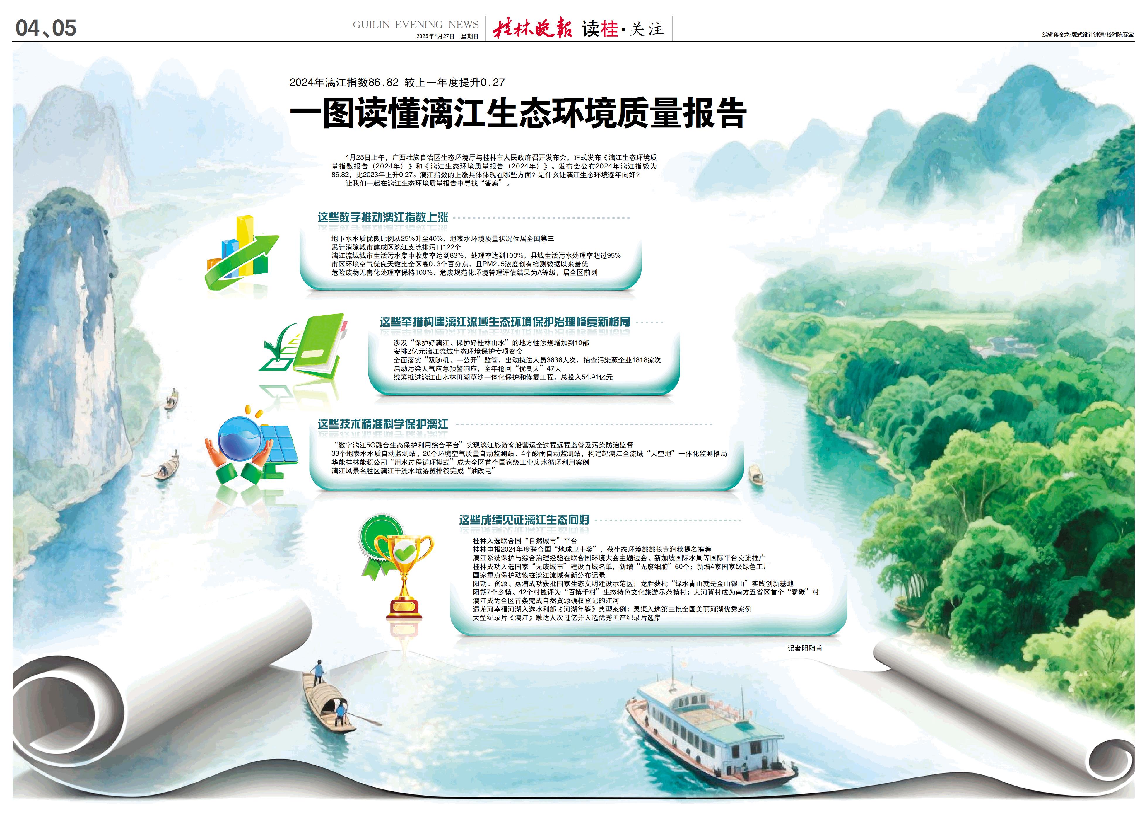 4月25日上午,广西壮族自治区生态环境厅与桂林市人民政府召开发布会,正式发布《漓江生态环境质量指数报告(2024年)》和《漓江生态环境质量报告(2024年)》。发布会公布2024年漓江指数为86.82,比2023年上升0.27。漓江指数的上涨具体体现在哪些方面?是什么让漓江生态环境逐年向好?