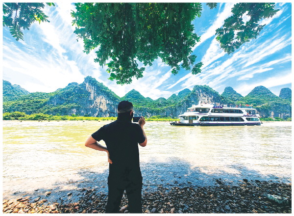 5月11日,一艘游船悠然驶过雁山区草坪回族乡潜经村附近的河段。抬眼望去,连绵起伏的青山与蓝天相接,构成一幅绝美的自然画卷。游船穿梭其中,恰似在画中徐徐前行。岸边,一位市民被这如诗如画的美景深深吸引,赶忙拿出手机,定格下这绝美瞬间。