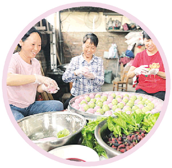 李丽芳(左)和家人一起制作桑葚粑粑。