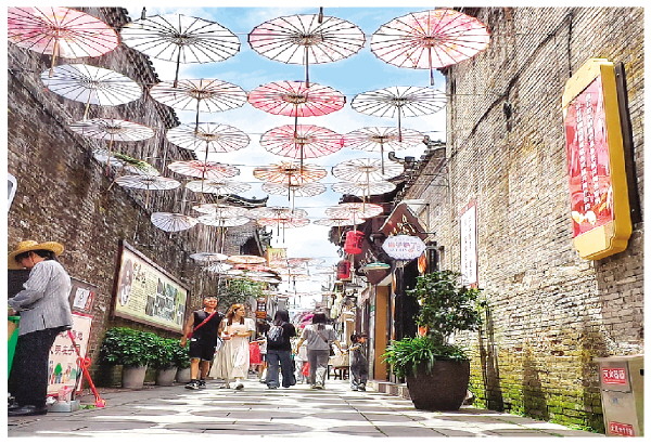 近日,在正阳东巷,市民游客从伞下走过。这些装饰伞不仅有一定的遮阳功能,还成为了一道风景,供大家观赏。