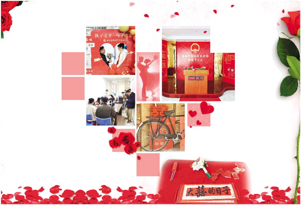 “我们估算过,平均每对新人要跟摄影师在颁证大厅拍摄一个小时。”工作人员指着照片墙上的新人合影说。在他身后,每一张合影都配上了爱心形状的相框。在最新的一组照片里,新人举着“我们领证啦”的横幅,露出灿烂的笑容。