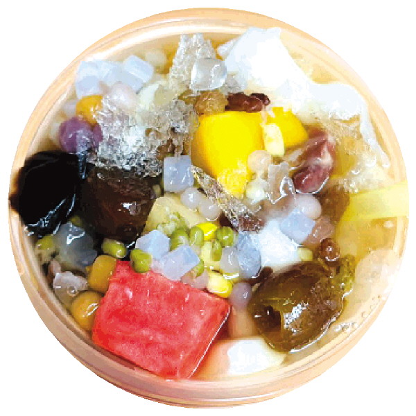 只见老板先在碗里放入切得大小均匀的新鲜西瓜、哈密瓜、芒果等水果,接着加入煮得恰到好处的西米、芋圆、绿豆、薏米、红豆、银耳、凉粉、仙草等小料,再舀上一大勺嫩滑的椰奶冻,随后撒上葡萄干、蜜枣,最后浇入满满的冰沙糖水,一碗色彩缤纷、料多到快满出来的清补凉就呈现在眼前。