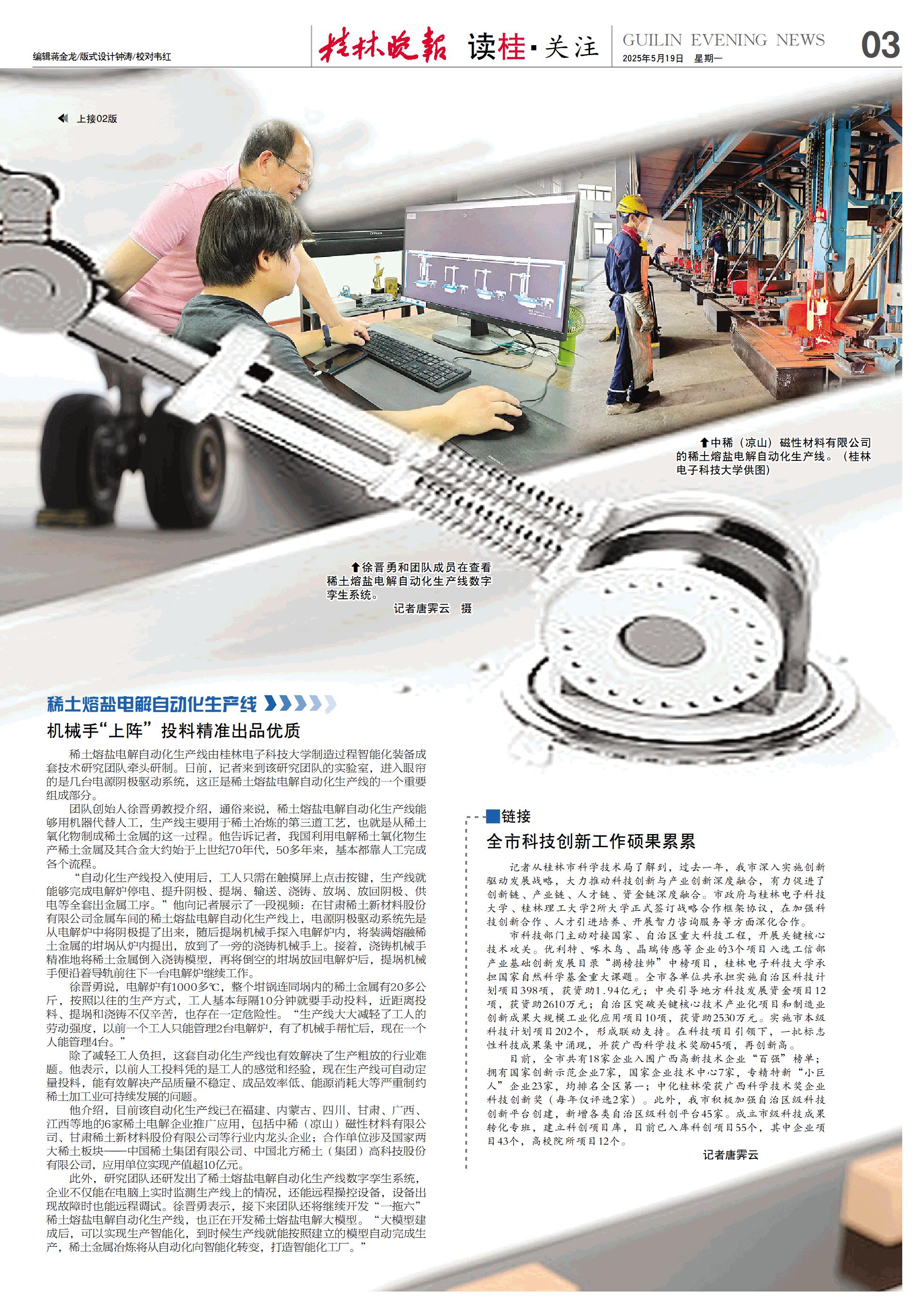 他介绍,目前该自动化生产线已在福建、内蒙古、四川、甘肃、广西、江西等地的6家稀土电解企业推广应用,包括中稀(凉山)磁性材料有限公司、甘肃稀土新材料股份有限公司等行业内龙头企业;合作单位涉及国家两大稀土板块——中国稀土集团有限公司、中国北方稀土(集团)高科技股份有限公司,应用单位实现产值超10亿元。