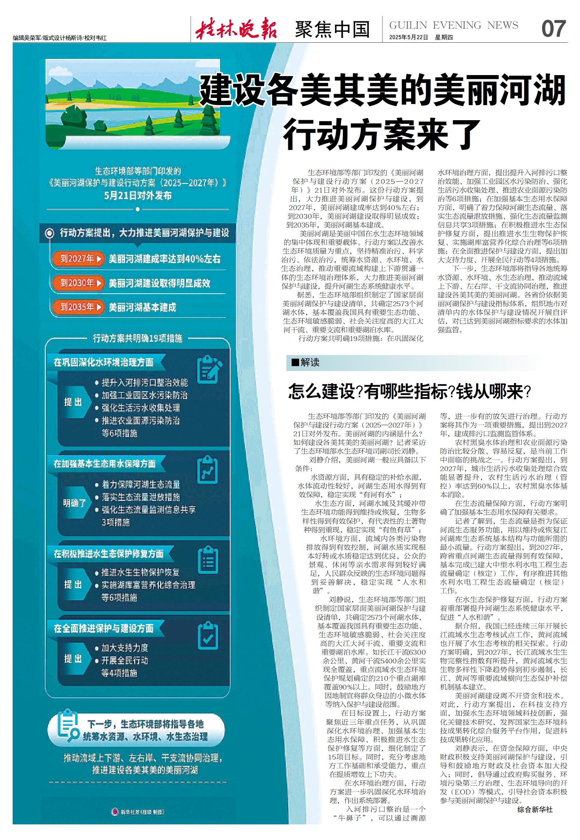 生态环境部等部门印发的《美丽河湖保护与建设行动方案(2025—2027年)》21日对外发布。这份行动方案提出,大力推进美丽河湖保护与建设,到2027年,美丽河湖建成率达到40%左右;到2030年,美丽河湖建设取得明显成效;到2035年,美丽河湖基本建成。
