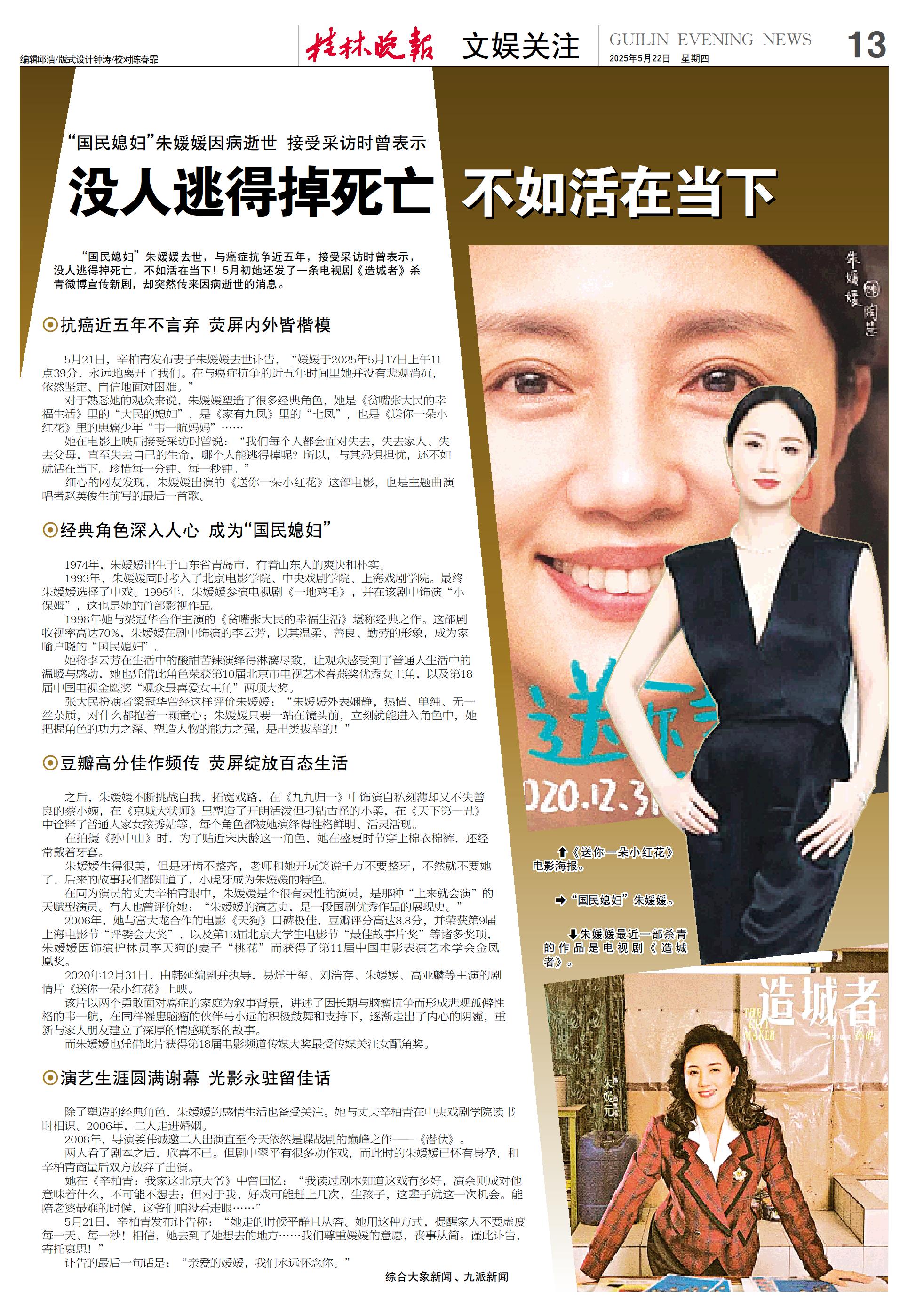 5月21日,辛柏青发布妻子朱媛媛去世讣告,“媛媛于2025年5月17日上午11点39分,永远地离开了我们。在与癌症抗争的近五年时间里她并没有悲观消沉,依然坚定、自信地面对困难。”