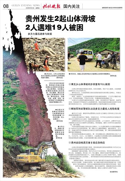 5月22日3时许和9时许,贵州省大方县长石镇和果瓦乡庆阳村分别发生一起山体滑坡。长石镇山体滑坡2名被困人员已找到,均已遇难。果瓦乡庆阳村山体滑坡有19人被困。事件发生后,当地公安、武警、应急、消防等部门已相继到达现场开展搜救工作。