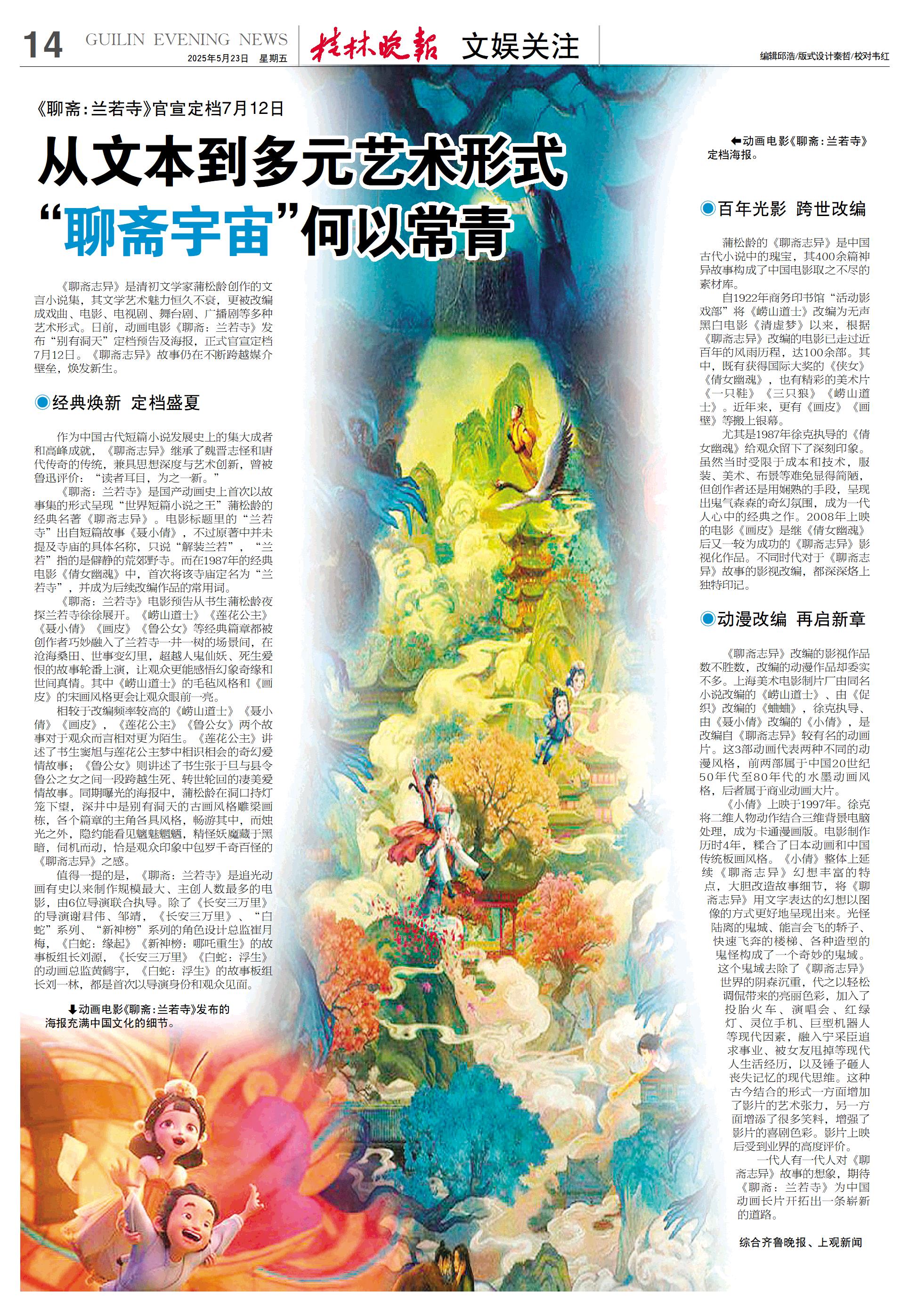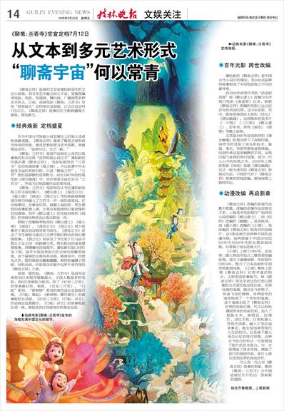 《聊斋志异》是清初文学家蒲松龄创作的文言小说集,其文学艺术魅力恒久不衰,更被改编成戏曲、电影、电视剧、舞台剧、广播剧等多种艺术形式。日前,动画电影《聊斋:兰若寺》发布“别有洞天”定档预告及海报,正式官宣定档7月12日。《聊斋志异》故事仍在不断跨越媒介壁垒,焕发新生。