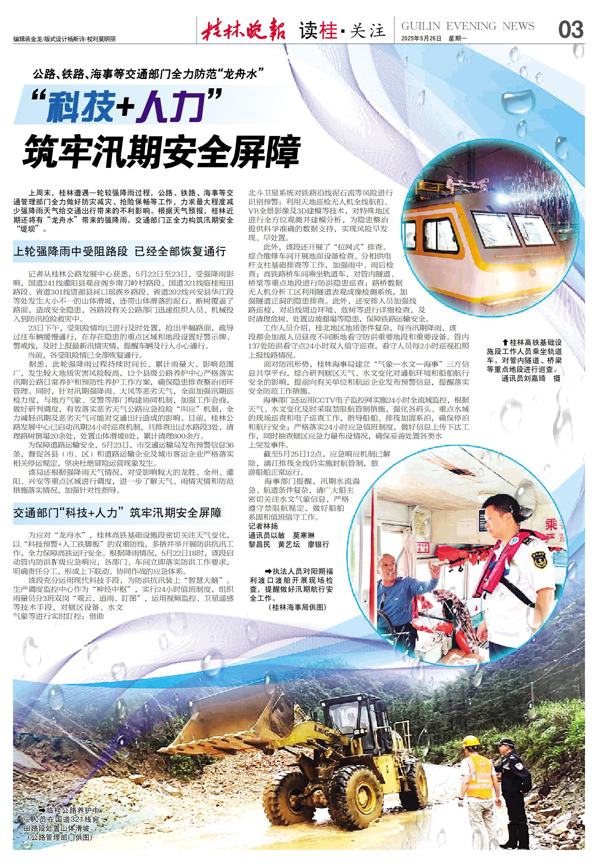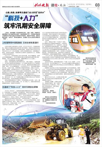 上周末,桂林遭遇一轮较强降雨过程,公路、铁路、海事等交通管理部门全力做好防灾减灾、抢险保畅等工作,力求最大程度减少强降雨天气给交通出行带来的不利影响。根据天气预报,桂林近期还将有“龙舟水”带来的强降雨,交通部门正全力构筑汛期安全“堤坝”。