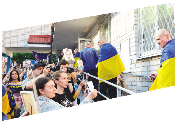 5月23日,乌克兰民众举着失踪军人照片向被释放乌军人询问下落。 新华社发
