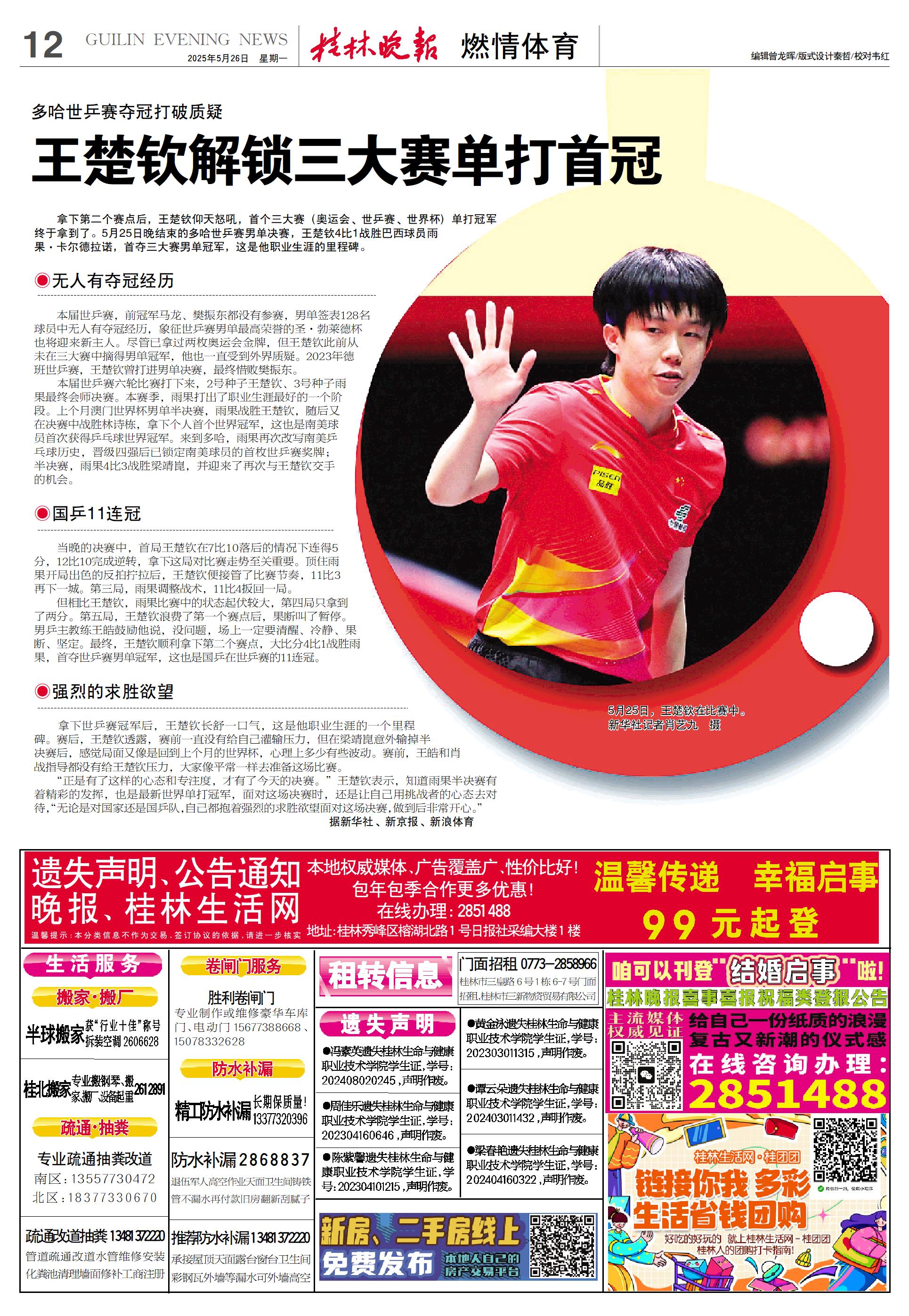王楚钦解锁三大赛单打首冠